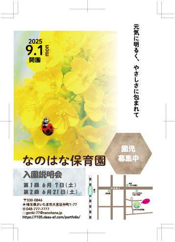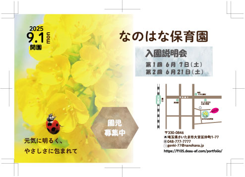 架空保育園「なのはな保育園」の開園にあたり、園児募集のDMを作成しました