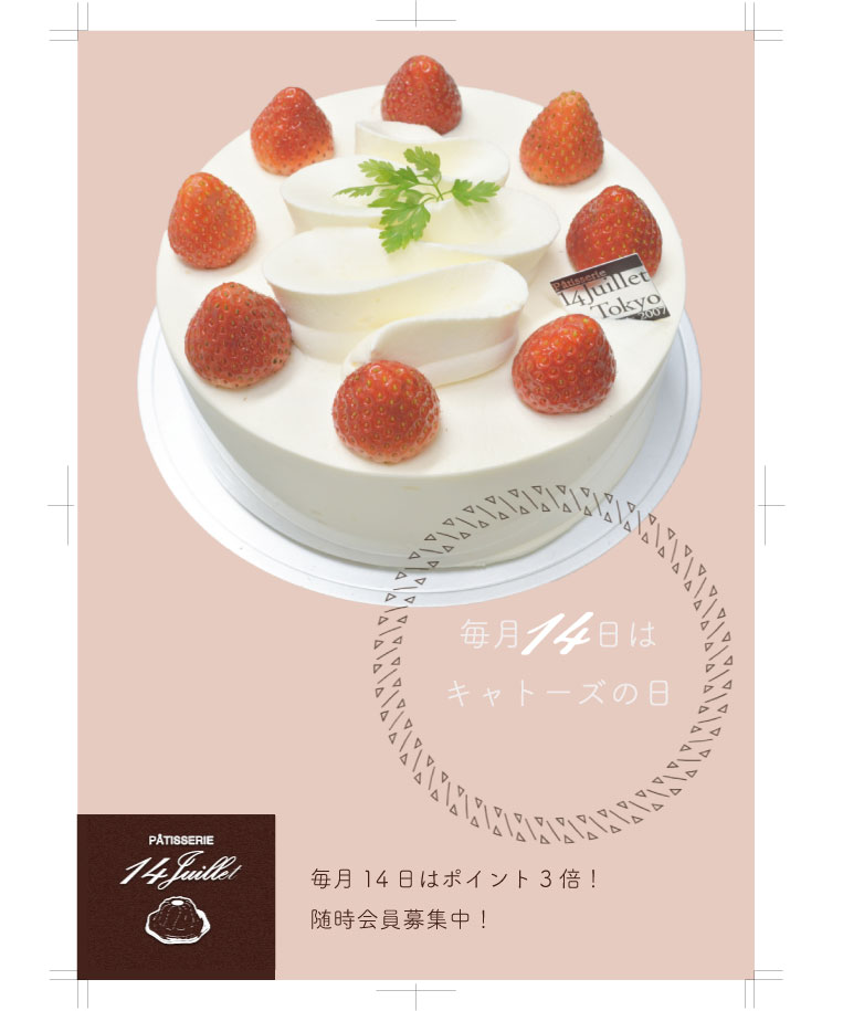 パティスリー「キャトーズ・ジュイエ」さんの店内掲示用として、毎月14日のポイント3倍デー「キャトーズの日」を告知するA4サイズのポップを制作しました。